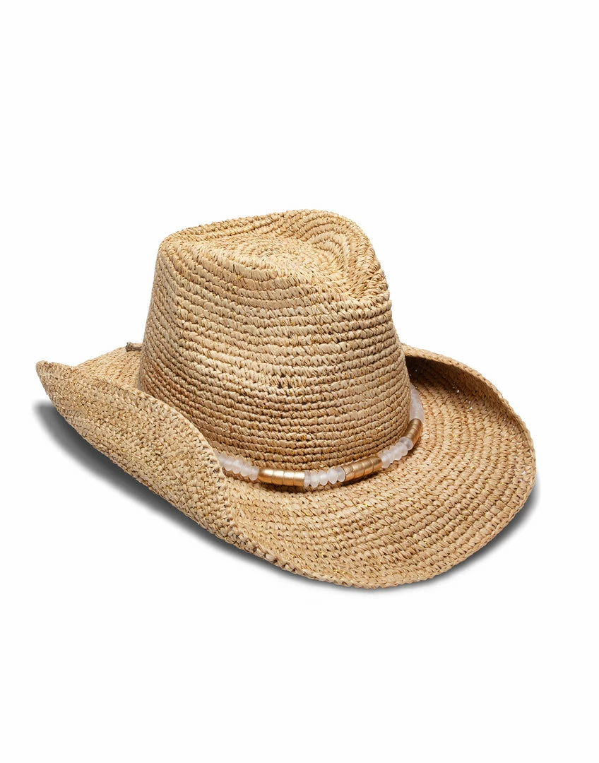 The Chrysta is a woven, cowboy style hat with hand-beaded detail. Brim can be adjusted as desired! Crochet Raffia with metallic shimmer, beach glass and metal trim.