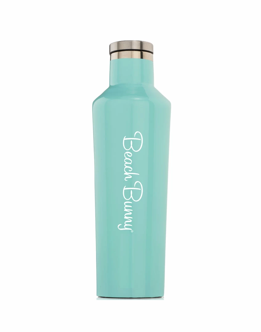 The original, colorfully cool Corkcicle Canteen in Gloss Turquoise. Canteen keeps drinks icy cold for 25 hours or nice and hot for up to 12. No bottle sweat. No freezing hands. Just perfect, mega-shine sips all day long.