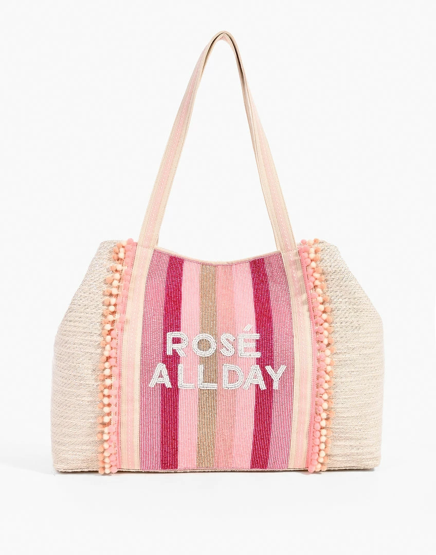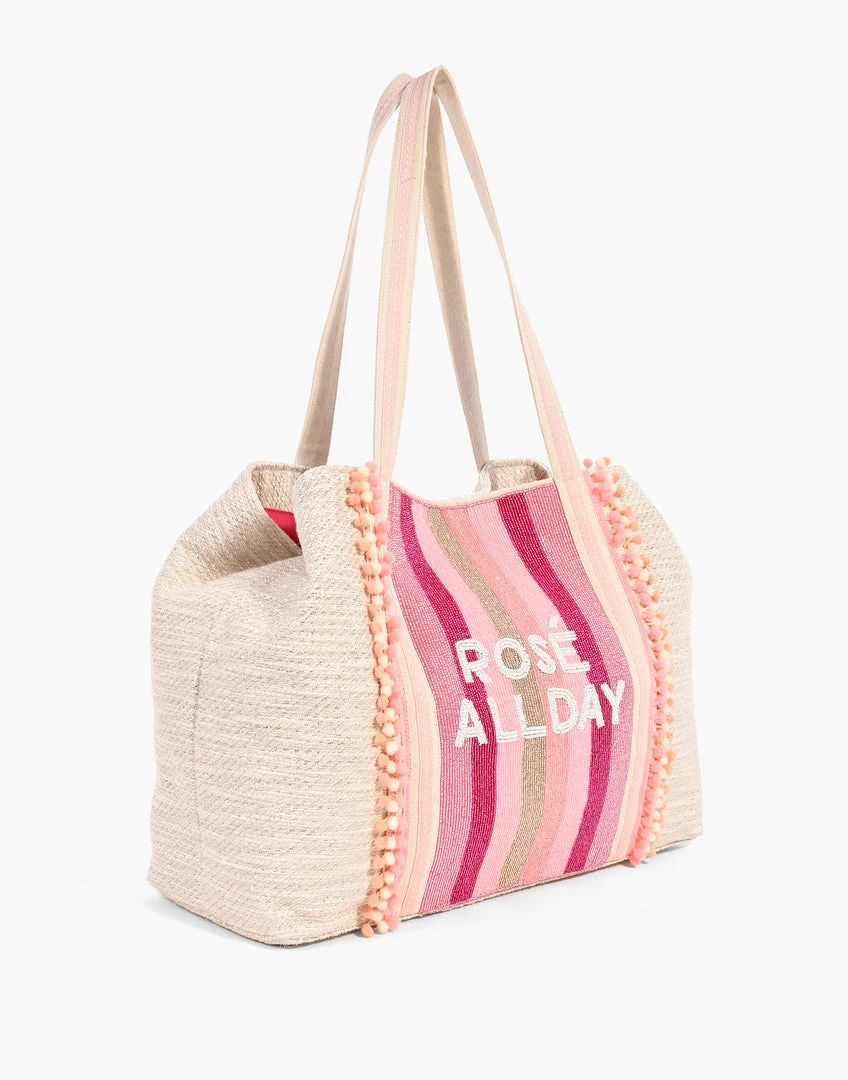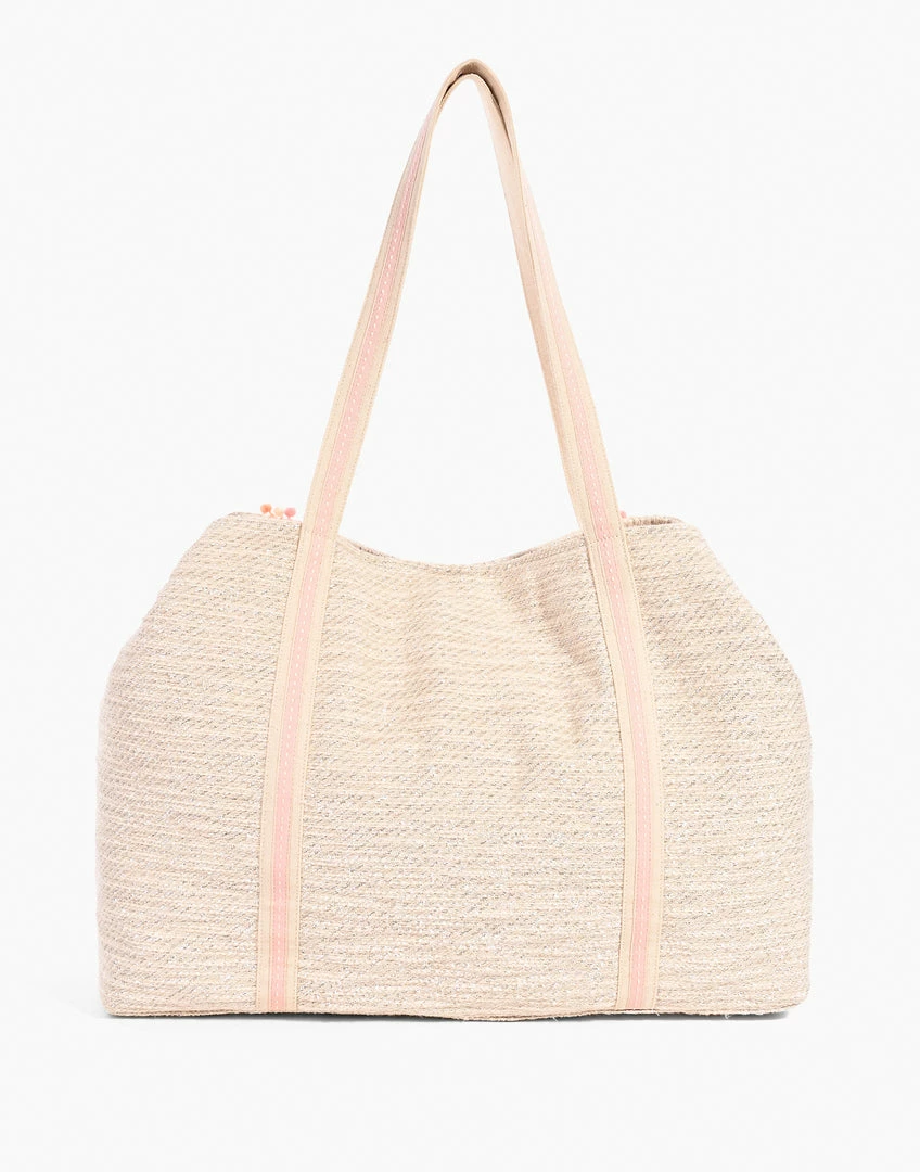 This tote has an off-white handwoven jacquard backing with silver lurex detail, and beautiful stripes beaded in shades of pink.