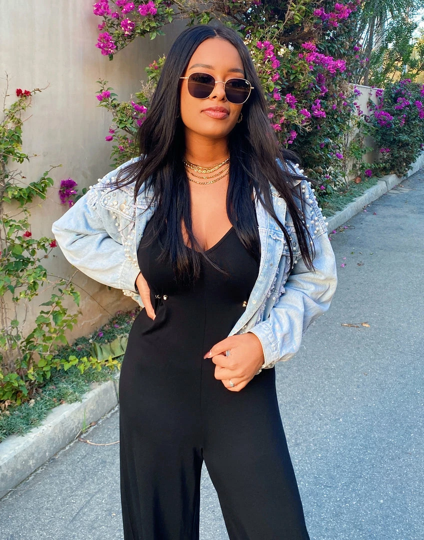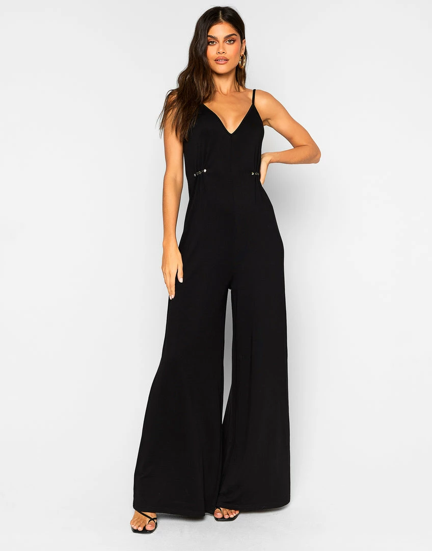 The Jesse Wide Leg Jumpsuit has a v-neck and features rhinestone trim details. This jumpsuit will have you feeling great whether it’s lounging at home or an evening out.