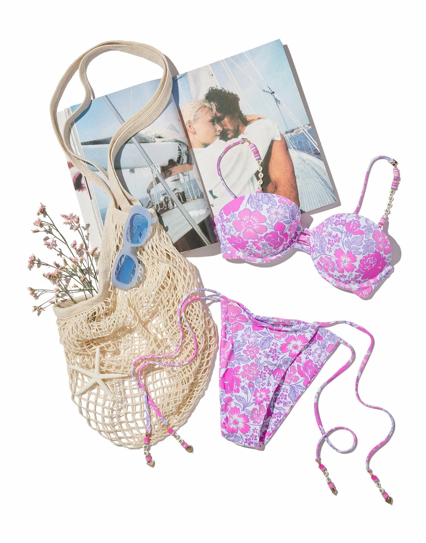 The Constance Tie Side Bottom features fun beaded trims. Complete this swim look by pairing it with the Estelle Triangle Top, Tula Bandeau Top or Rockie Underwire Top.