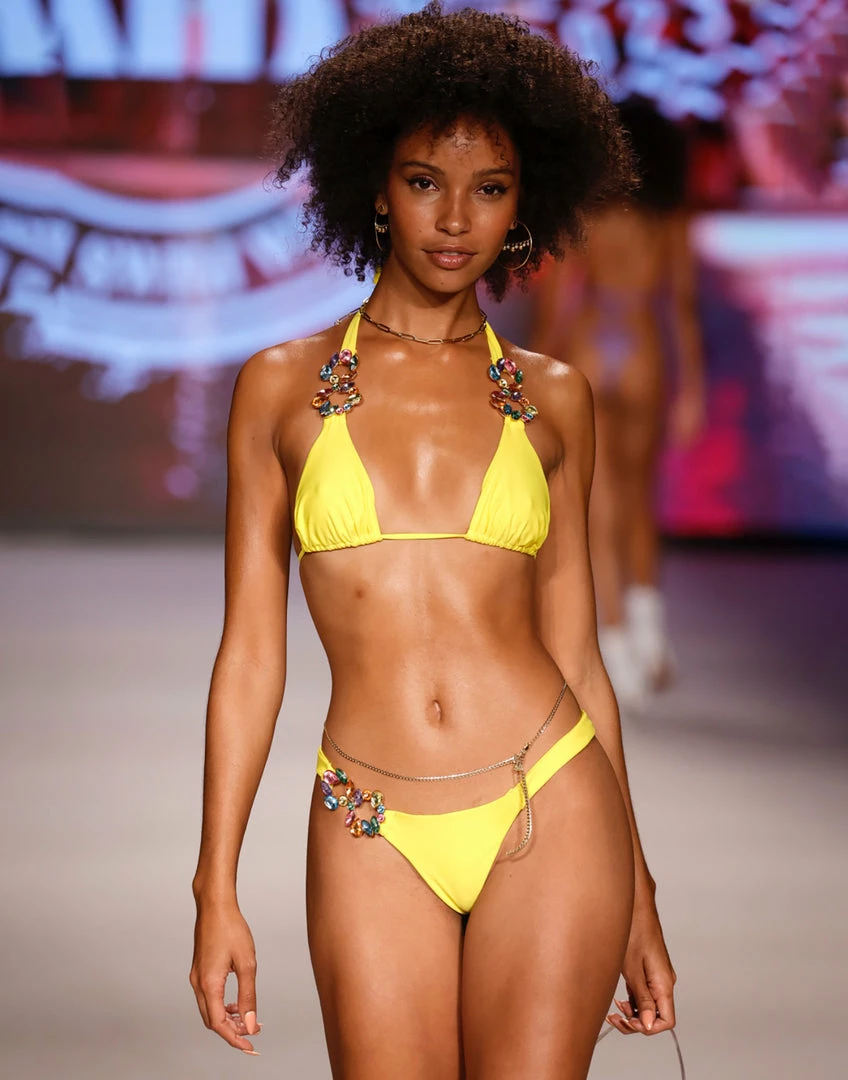 The Dakota Triangle Top features gorgeous multicolored crystal hardware pieces. Complete the look by pairing it with the Elle Asymmetrical Tango Bottom.