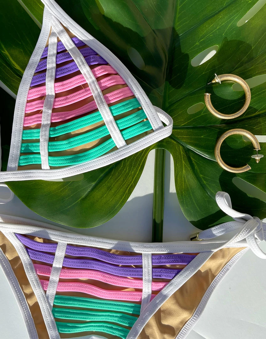 Our Hard Summer group is definitely one of our sexiest bikinis. The rows of binding nude lining to give the illusion of skin.
