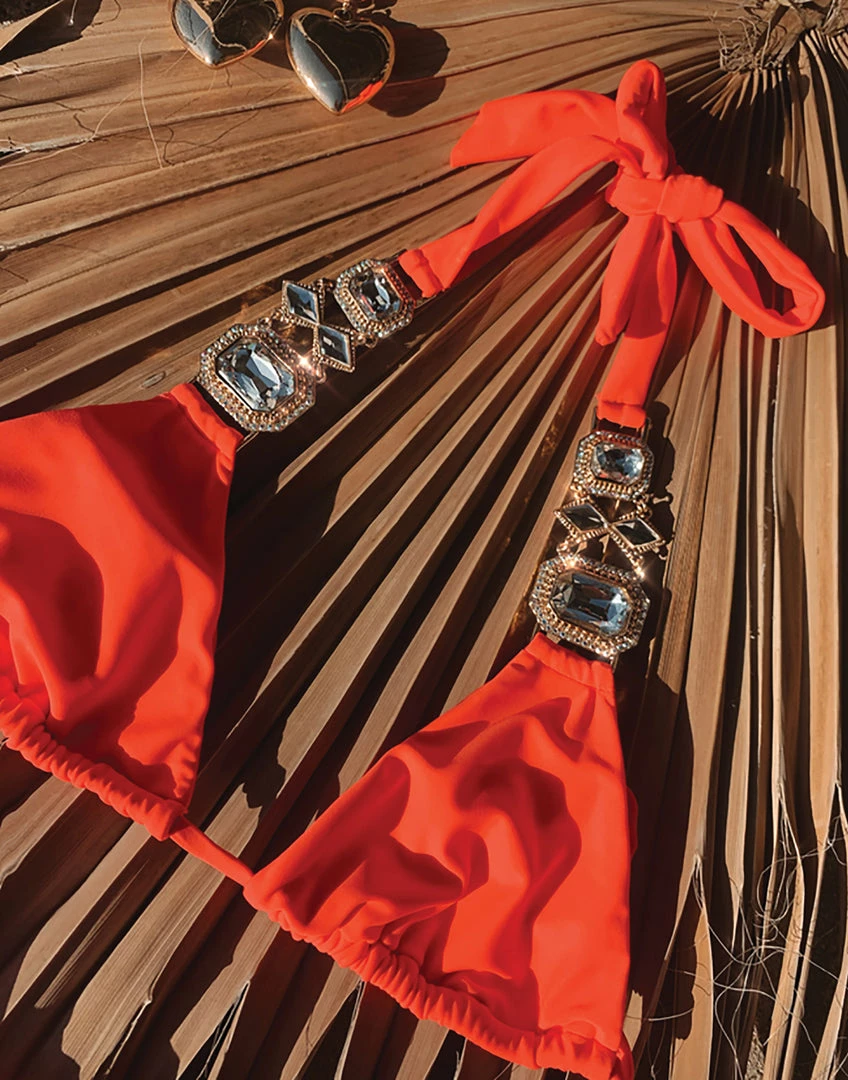 The Jazmin bikini is a Beach Bunny classic that features extravagant rhinestone embellished hardware. Great for pool parties!