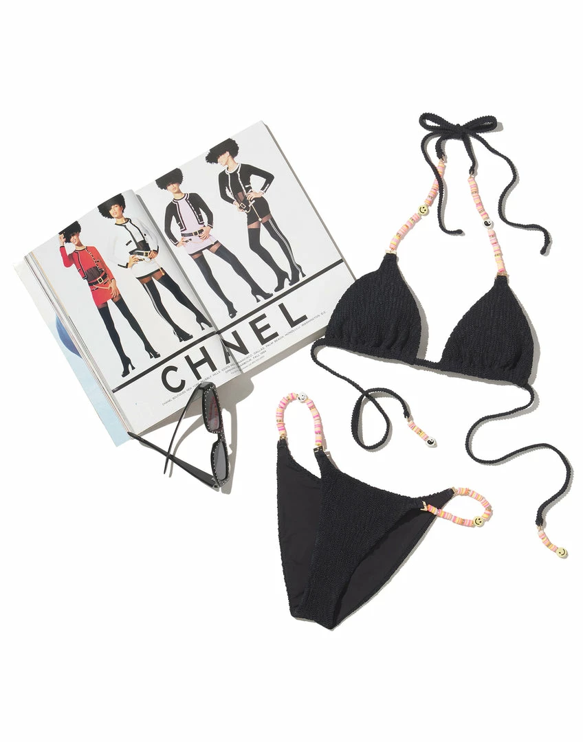 The Josie Triangle Top features fun beaded trims and tries at the front center.