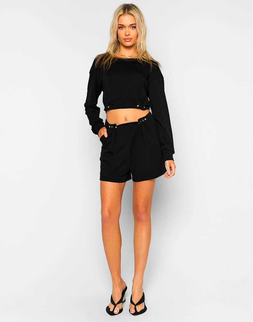 The Logan Pullover has a crop fit and features rhinestone trim details. Pairs with the Logan Short or Jesse Wide Leg Pant.