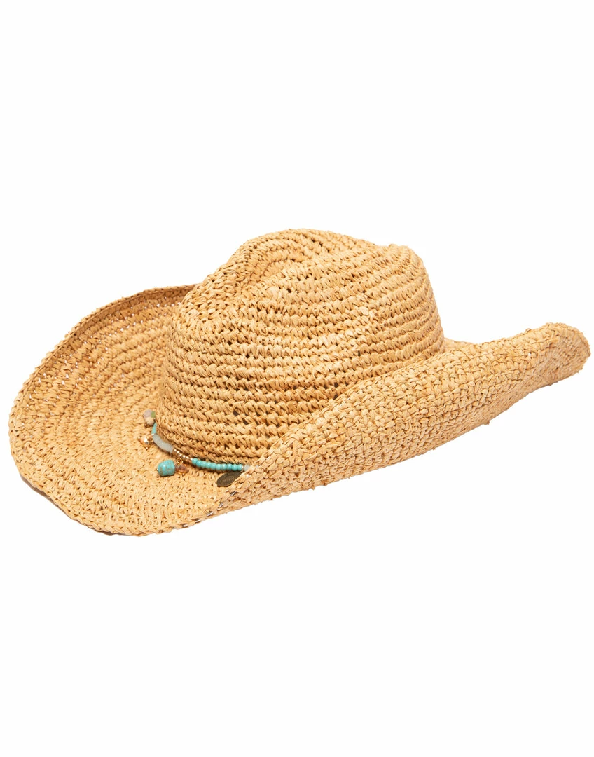 The Crochet Raffia Cowboy Hat features beaded trim and faux suede tie.