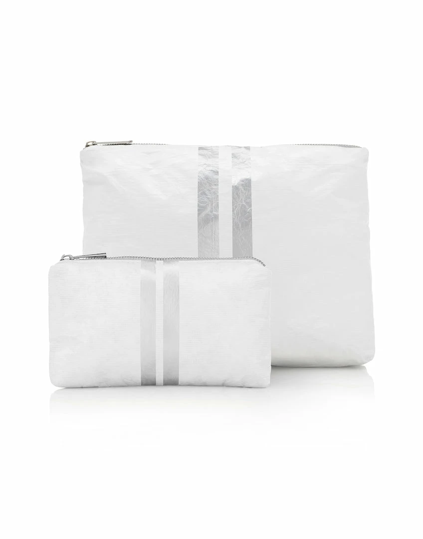 Hi Love reimagined the classic solid pack with contrasting vertical stripes in silver. Includes a matching collection of Two Packs! One Medium Pack and One Mini Padded Pack.